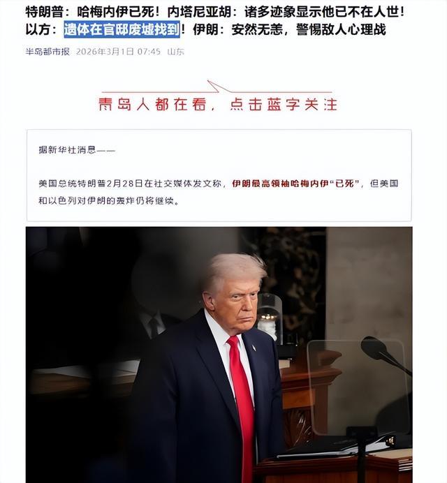 特朗普28日在社交媒体上直截了当地宣称,伊朗最高领袖哈梅内伊已经身亡。