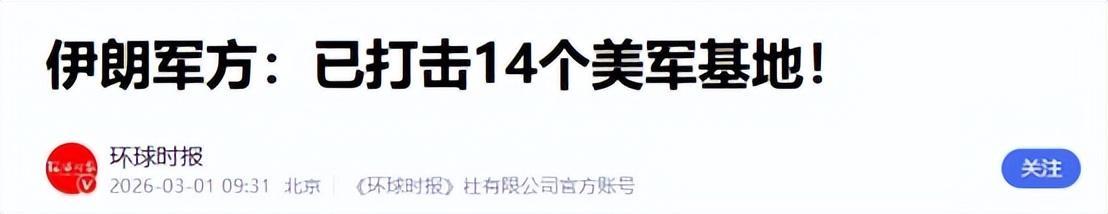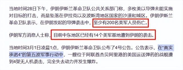 28日到3月1日凌晨,在伊朗发动的至少五波导弹和无人机反击中,中东地区已经有14个美军基地遭到袭击,至少有200名美军人员伤亡。