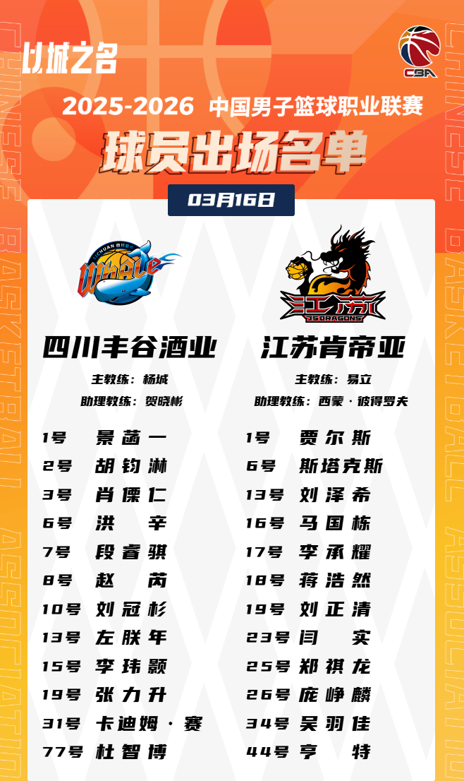 虎扑03月16日讯 今晚CBA常规赛,四川对阵江苏大名单已经公布。
